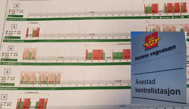 Kontrollørene på Ånestad kontrollstasjon har analysert utskrifter som dette for å avsløre brudd på reglene for kjøre- og hviletid. Illustrasjon: Statens vegvesen