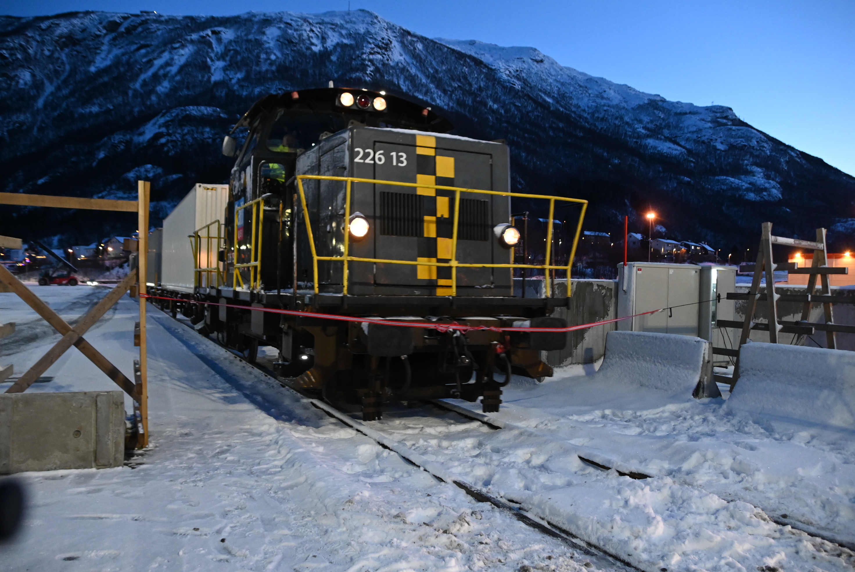 Johan Vasara signalerte til det ventende godstoget at det kunne kjøre inn på en flunkende ny terminal i Narvik. Det fikk bryte flaggbåndet, og starte fyrverkeriet som lyste opp himmelen.
