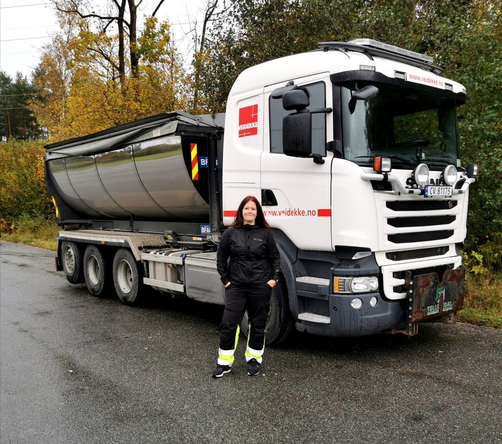 Sabine Endresen Haugen (36) er lastebilsjåfør. Hun er vant til å få spørsmål om yrkesvalget sitt, og hun har ingen problemer med å svare. Sabine kjører lastebil fordi det er gøy! Og fordi hun fikk muligheten til å komme på kurs.
