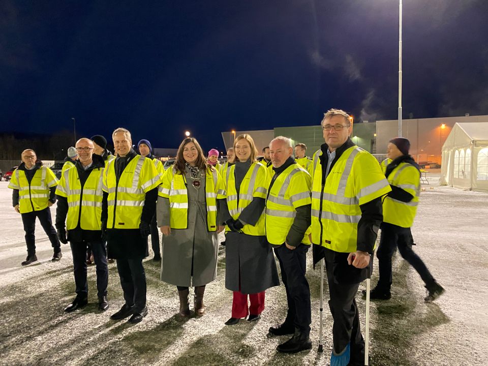 Åpningen av den utbygde godsterminalen på Fauske tiltrakk seg storfint besøk. Bak til venstre: Carl Fredrik Karlsen, konstituert administrerende direktør i CargoNet. Foran fra venstre: Svein Eggesvik, fylkesråd for transport i Nordland fylkeskommune, samferdselsminister Jon-Ivar Nygård, ordfører i Fauske Marlen R. Berg, ordfører i Bodø Ida M. Pinnerød, ordfører i Saltdal Rune Berg, og Thor Brækkan, områdedirektør i Bane NOR. Foto: Stein-Hugo Steffensen/Bane NOR