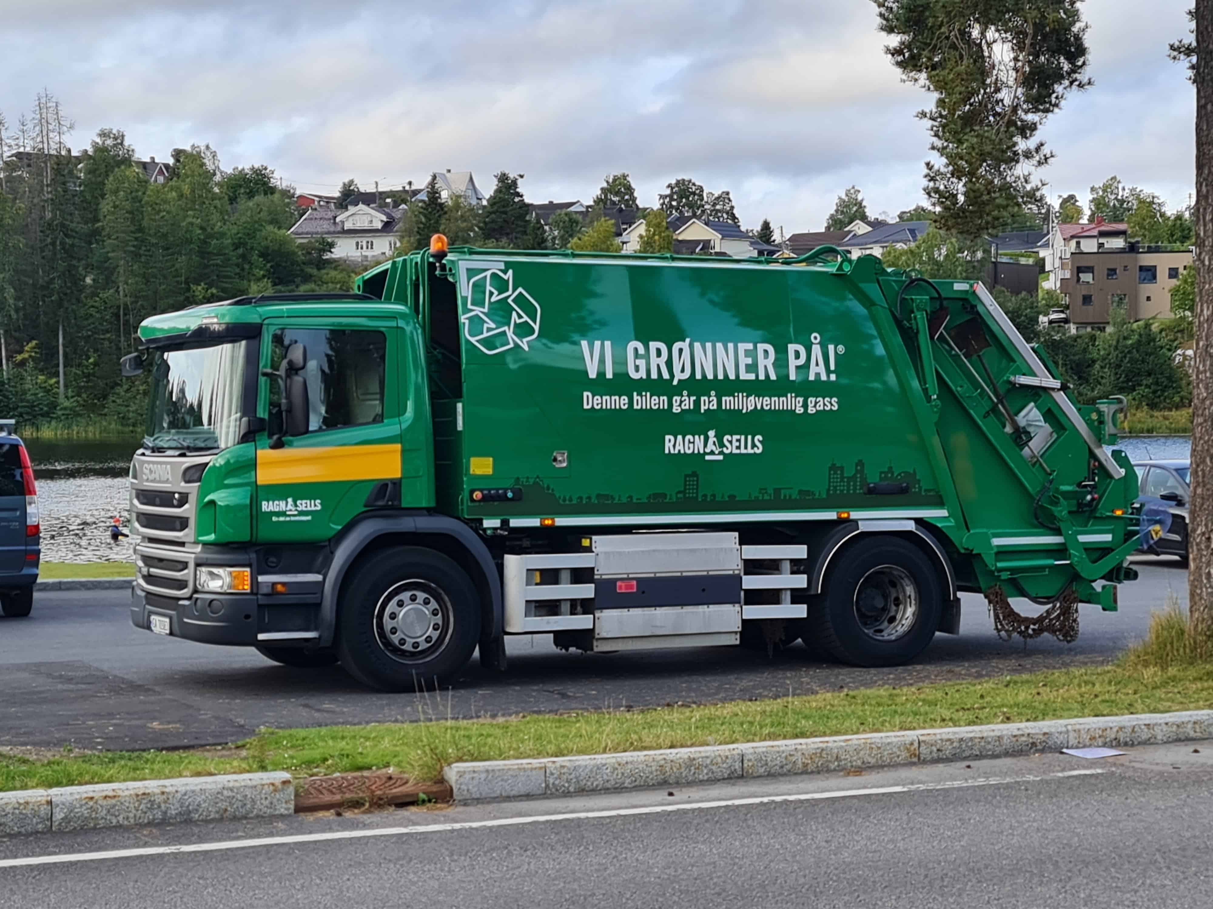 På bildet ser du en av Ragn-Sells sine renovasjonsbiler som går på biogass, med slagordet "Vi grønner på". Foto: Ragn-Sells