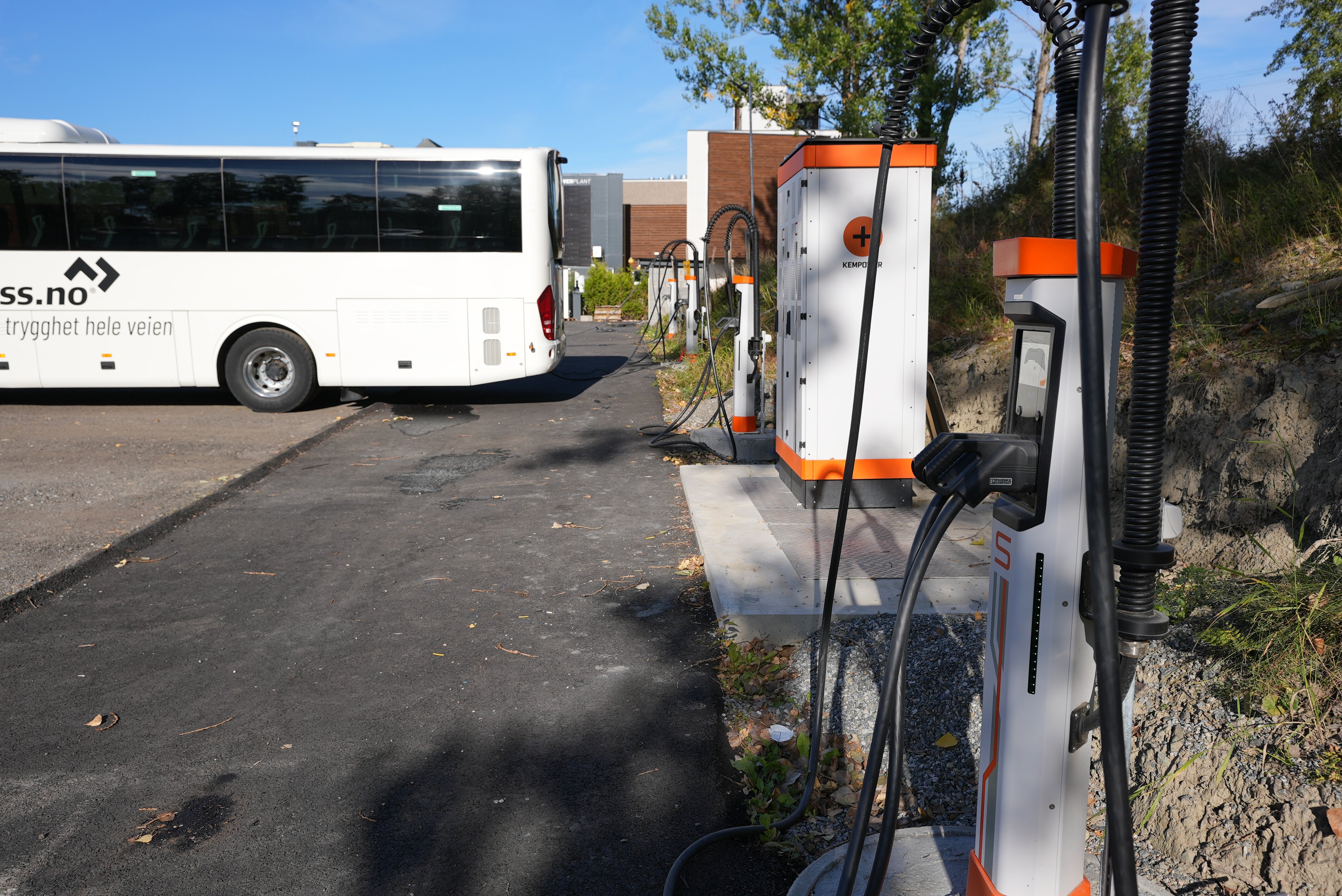 OsloBuss sitt ladeanlegg på Haugenstua i Oslo står på selskapets område og er såkalte dedikerte ladere. Foto: Enova