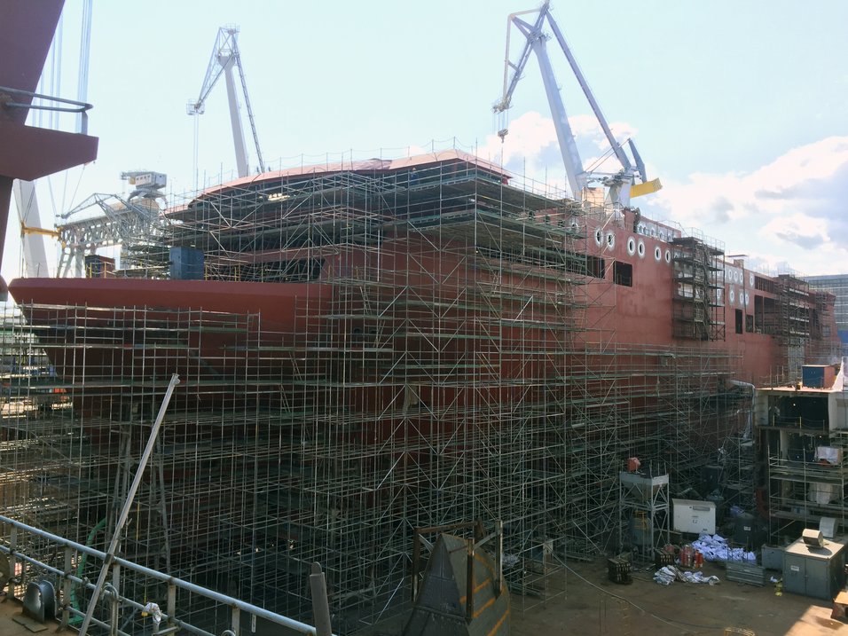 Hele 70 prosent av leverandørene er en del av den maritime klyngen i Norge. Stålskroget nærmer seg ferdigstillelse og i slutten av oktober blir skipet tauet fra Polen til Ulsteinvik.