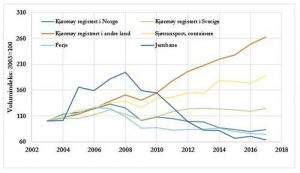 - Varer lastes om til lastebiler før ankomst i Norge. Det har vært en økning i omlasting og distribusjon fra Sverige, initiert av at importører og logistikkaktører i økende grad etablerer sentrallagre og logistikksentre i særlig Sverige, noe som muliggjør transport med transportører fra lavkostnadsland i distribusjonen til detaljist i Norge.