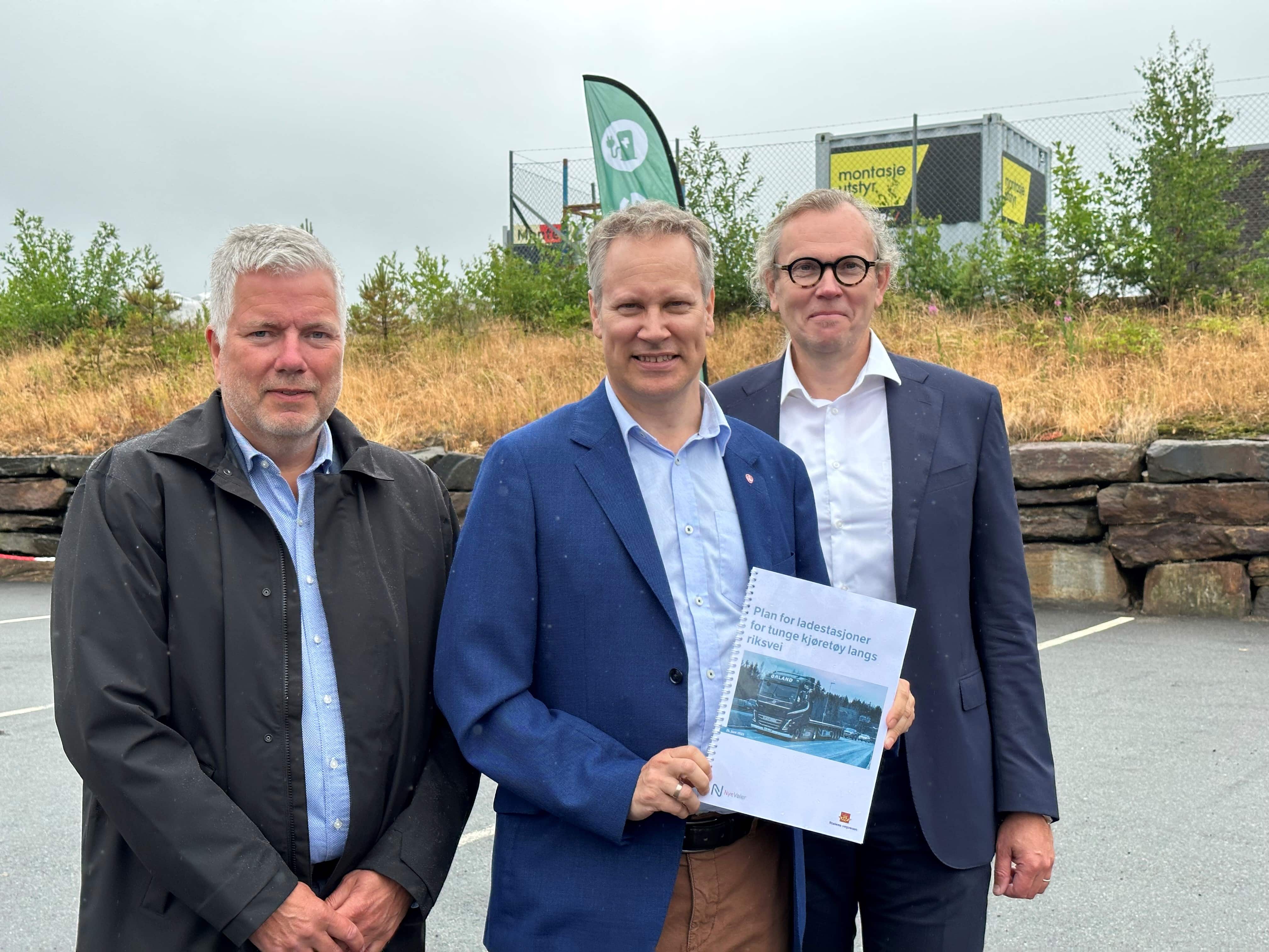 Samferdselsminister Jon-Ivar Nygård mottok planen for utbygging av ladestasjoner langs riksveinettet for tunge kjøretøy i Lillesand mandag fra Ove Myrvåg i Statens vegvesen (t.v.) og Finn Aasmund Hobbelstad i Nye Veier (t.h.). Foto: Edvard Andersen/ Samferdselsdepartementet