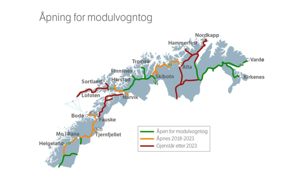 Fra før er blant annet hele riksvegnettet i Øst-Finnmark åpent for modulvogntog. Det samme gjelder E6 sør for Skibotn i Troms med forbindelser til Tromsø og Finnsnes, samt E10 mellom Tjeldsundbrua og Sverige.