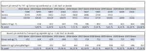 Tabell 1 og 2: Den øverste tabellen viser andel elever som går over til VG2 Transport og logistikk (VG2 TL) fra TIFF og Service og samferdsel. Etter 2019 ser vi et tydelig dropp som følge av at de mistet all rekruttering fra service og samferdsel. Tabell to, viser at det er et lite dropp i antall elever som søker seg fra VG2 TL og over til VG3 yrkessjåførfaget.