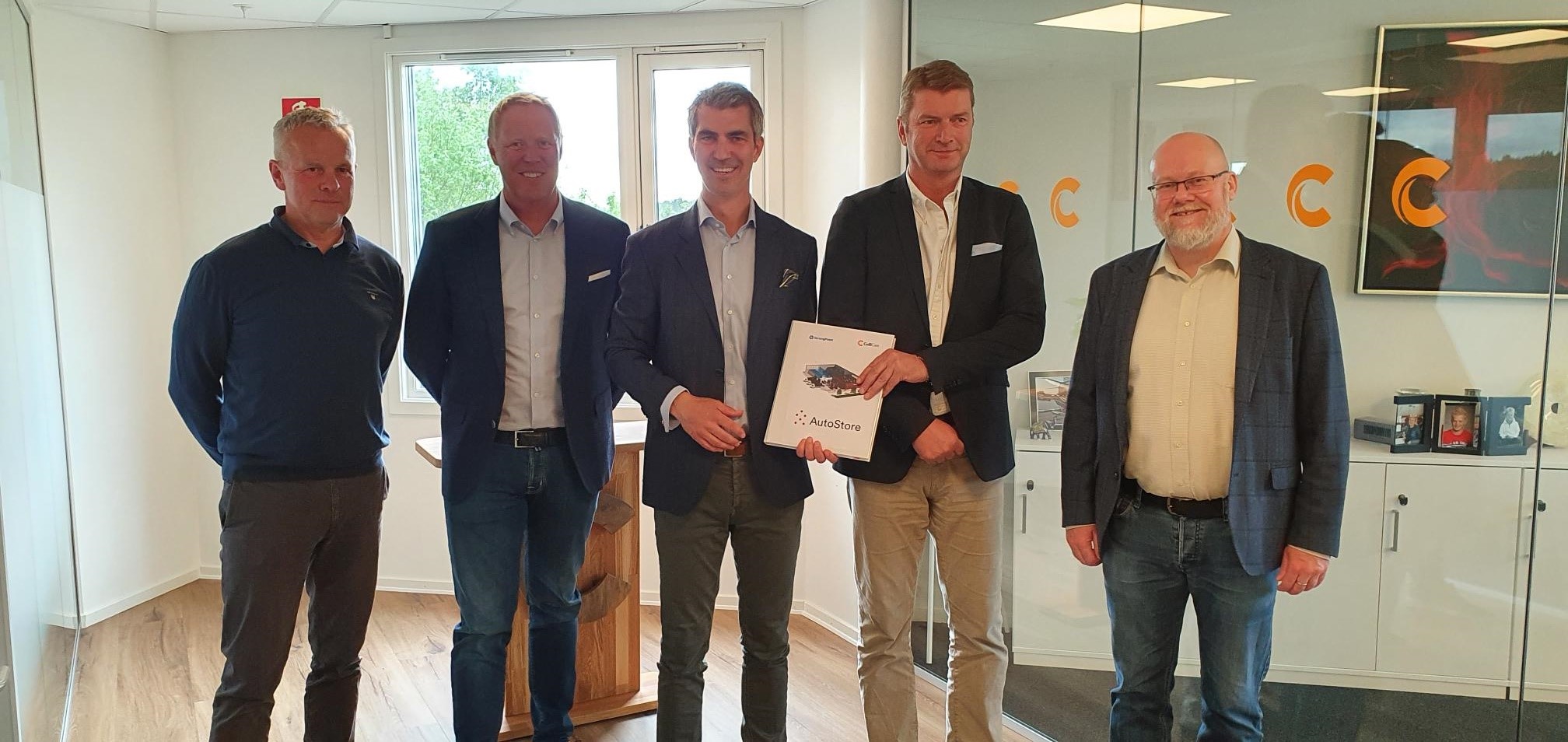 StrongPoint er tildelt AutoStoreløsningskontrakt av ColliCare Fra venstre på bildet: Ole Bakurowitz, Country Manager ColliCare, Lasse Bjørnerud, Salgsdirektør E-Commerce StrongPoint AS, Jacob Tveraabak, CEO StrongPoint ASA, Knut Sollund, CEO ColliCare og Tom Jarle Dehkes, Nova Retail. Foto: StrongPoint ASA
