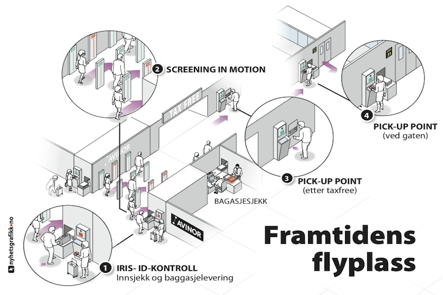 En førerløs bil kjører deg til lufthavnen, du sjekker inn bagasjen med iris-skanning – og går rett gjennom sikkerhetskontrollen der du kontrolleres mens du er i bevegelse. Det kan bli framtiden på Avinor sine lufthavner.